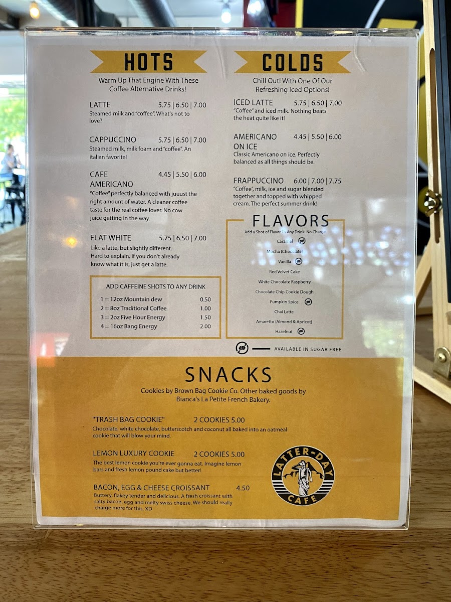 Welcome to Latter-Day Cafe, a vibrant spot located at 124 S State St in Orem, UT. Known for its unique take on coffee, this cafe transforms traditional beverages into flavorful delights that are both enjoyable and health-conscious. Patrons rave about the friendly staff who engage warmly with customers and ensure a stellar ordering experience.